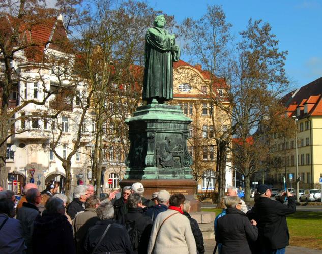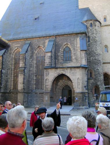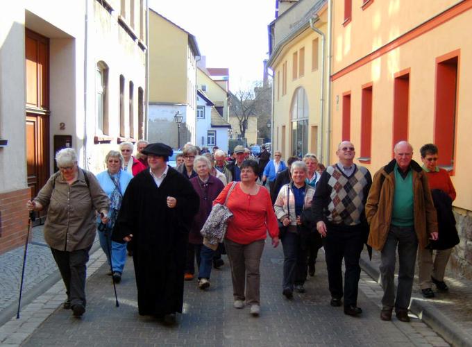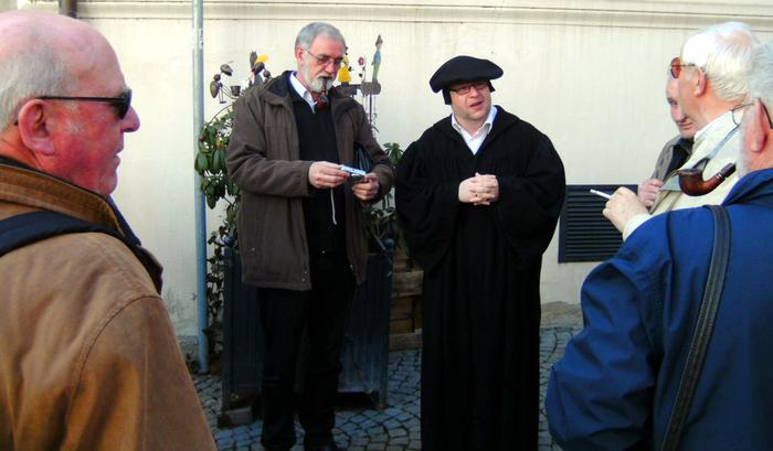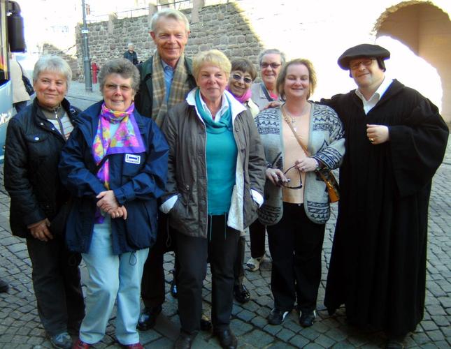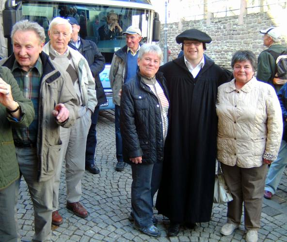 Der letzte Reisetag führte zunächst zu Luthers Geburts- und Sterbeort Eisleben. Dort empfing der Reformator höchstpersönlich die Reisegruppe (alias Stadtführer Torsten Lange-Klemmstein in historischem Kostüm). „Das ist ein wunderbarer Gag“, freute sich Mitfahrerin Christel Kantz. So zeigte „Luther“ der Gruppe zunächst sein Geburtshaus und seine Taufkirche St. Peter und Paul, wo er am 11.11.1483 ein Tag nach seiner Geburt auf den Namen des Tagesheiligen Martin getauft wurde. Über den Marktplatz mit dem Lutherdenkmal erreichten die Besucher die Andreaskirche, wo Luther bis kurz vor seinem Tode seine letzten Predigten hielt. Auch das sich nach neuesten historischen Forschungen im Hotel „Graf von Mansfeld“ befindliche Sterbezimmer Luthers stand auf dem Besichtigungsprogramm.