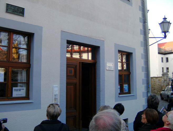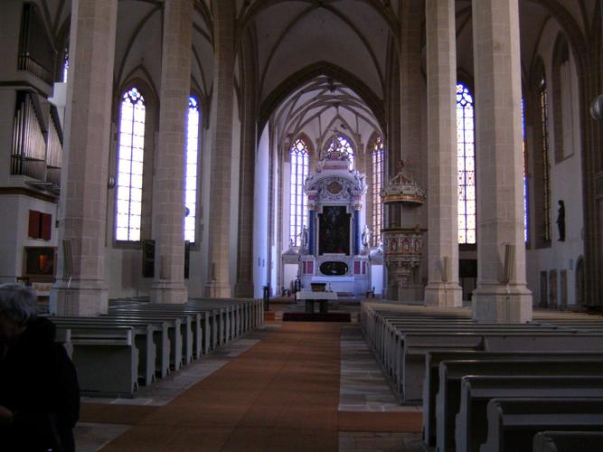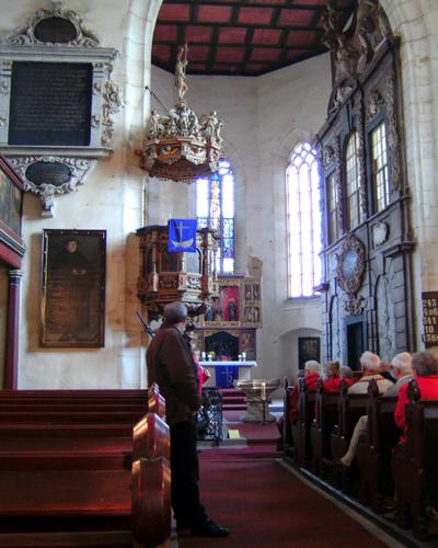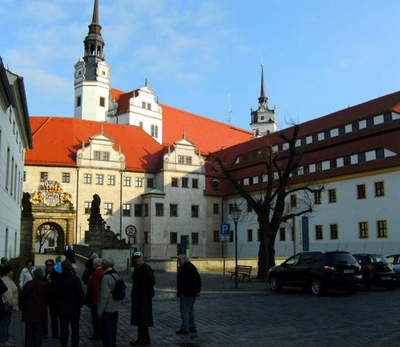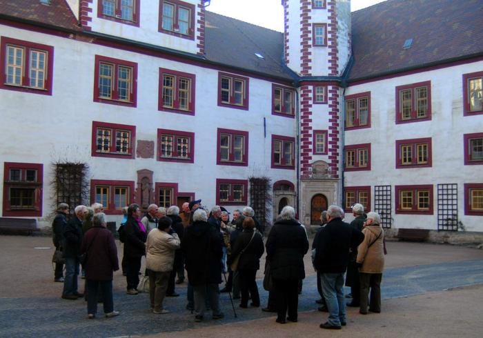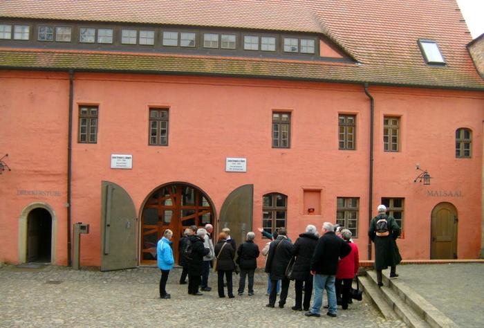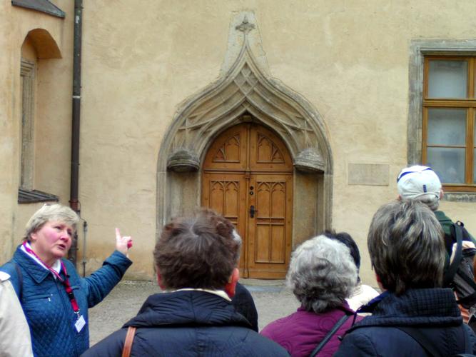 Nachmittags stand als Reiseziel Torgau auf dem Programm. Luther weilte nachweislich 40-mal in dieser Stadt, wo die Reformatoren sich auf den Reichstag in Augsburg 1530 vorbereiteten und als Grundlage für die Confessio Augustana die sogenannten „Torgauer Artikel“ verabschiedeten. Nach einem Gang über den Marktplatz besichtigte man das Sterbehaus von „Käthe“ Luther, geb. von Bora und anschließend ihre Grabstätte in der Stadtkirche. „Diese Frau hat ebenfalls Reformationsgeschichte geschrieben“ erklärte Stadtführerin Frau Henjes ehrfurchtsvoll. Nicht weit von der Stadtkirche liegt das Schloss Hartenfels, Residenz der sächsischen Kurfürsten und damals ein Zentrum der Reformation. Die dortige Schlosskapelle weihte Luther 1544 als ersten protestantischen Kirchenbau ein.