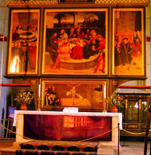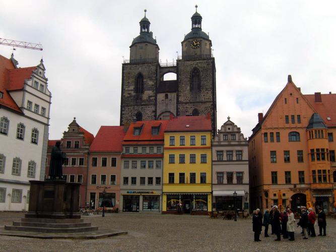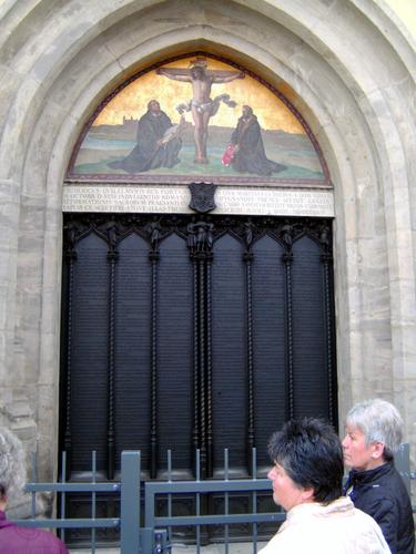 Anderentags war der authentischste Ort der Reformationsgeschichte im Besuchsprogramm vorgesehen: Wittenberg. Zuvor stimmte Pfarrer Kraft, wie an allen Tagen, die Reisegruppe mit besinnlichen Gedanken und passenden Liedern auf die Besichtigungsstätten ein. Der Rundgang unter fachkundiger Leitung begann am Lutherhaus, das frühere Klostergebäude, in dem Luther lebte und arbeitete mit dem Portal der Katharina von Bora (Luthers Ehefrau); er führte weiter am Melanchthonhaus vorbei zur ehemaligen Universität, wo Luther lehrte, zur Stadtkirche mit ihrem berühmten Bildaltar von Lucas Cranach. An die Cranach-Häuser und über den Marktplatz mit Rathaus führte der Weg zur Schlosskirche mit der 95-Thesentür und den Gräbern von Luther und Melanchthon. „Es ist schon etwas Besonderes, an Luthers Grab zu stehen“, brachte Margit Hinkel ihre Gefühle zum Ausdruck.