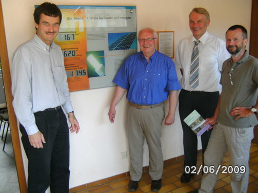 Sie haben gut lachen: Pfr. Tobias Kraft (l.) erläuterte MdB Klaus Hagemann (2.v.l.) im Rahmen einer Besichtigung am 02. Juni 2009 an der Messtafel der Fotovoltaikanlage (4,8 kWp) im Ev. Gemeindehaus Nack die momentan gelieferten Energiewerte. Der Bundestagsabgeordnete des Wahlkreises Alzey-Worms begleitet das Projekt gleichsam als Pate seit Errichtung im Jahre 2001 und ließ sich anlässlich seines Besuches in der Kirchengemeinde über die Arbeit der „AG Bewahrung der Schöpfung“ informieren. Aktuell hatten sich die Kosten der Anlage amortisiert; ca. 37.000 kwh wurden bisher produziert. Mit dabei: Lutz Quester (r.) u. Dr. Manfred Sauer aus dem Kirchenvorstand als Experten und Wegbereiter des Projekts.
