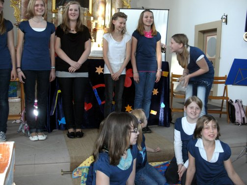 Als Sprecher der musikalischen Erzählung fungierte Marcel Schäfer. Die Kinder klagten im Chor: Alles verloren unsre Hoffnung ist zerplatzt. Dann setzt die zentrale Begebenheit ein: Die Sängerinnen, Catharina Beck und Annalena Bösel verkörpern nun die beiden Emmaus-Jünger, „Kleophas und seinen Freund“, denen auf dem Weg von Jerusalem nach Emmaus „ein Mann“ begegnet. Es dauert eine Weile, bis sie den Mann beim Brechen des Abendmahl-Brotes als „Jesus den Auferstandenen“ erkennen. Und dies wird nun ganz laut in die Kirche hinein gesungen und mit frenetischem Klatschen unterstützt besungen: „Er lebt! Er lebt“. Bei letzterem überaus flott gesungenen Lied springt der berühmte Funke in den Kirchensaal – und alles macht mit. Kirchenvorstand Fritz Stock: Die Kinder haben sie verstanden, diese Emmaus-Geschichte transparent zu machen. Susanne Kraft: Die Kinder waren in den vielen Proben. Der Chor „Pusteblume“, 1999 entstanden, führte das Musical bereits beim Reformationsfest 2008 auf. Mittlerweile laufen die Vorbereitungen für ein neues Musikprojekt.